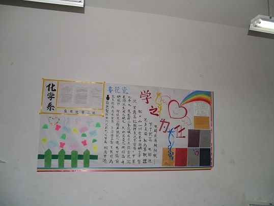 为响应我院学风建设活动,我系将“班级文化墙”作为学风建设的一项重要内容。 自11月份以来,我系各班教室的墙壁上陆续多了一道道靓丽的风景线,那就是各班经过精心设计的反映班级整体风貌的文化墙。各班的文化墙设计独树一帜,内容新颖,风格多异,各班同学积极参与,大家各显其能。
