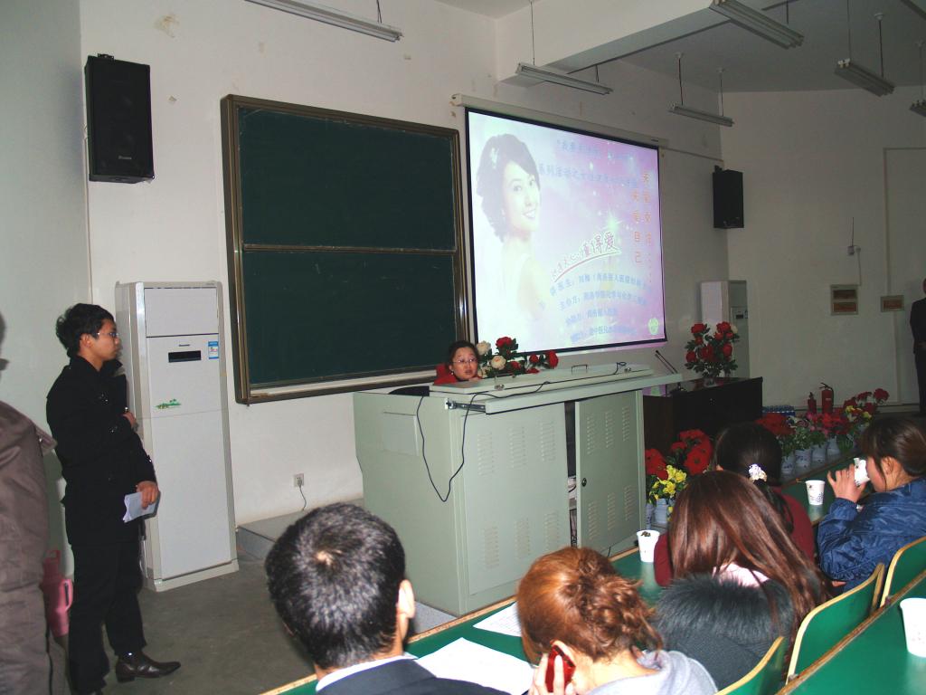 2011年11月19日(星期六)19:00-21:30,“商洛学院化学与化学工程系首期女性健康知识讲座”在商洛学院报告厅三举行,此次活动由老中医化妆品商洛分店赞助,商洛学院化学与化学工程系主办,商州丽人医院协办。活动目的在于丰富女同学的健康知识,增加女生对自身疾病的了解,同时提升女生的自我保健和关爱自己的意识,使女生在生活中表现的更自信、健康与美丽,在社会中能更好地展现女生的风采。活动到场的嘉宾有:商州丽人医院妇科主任刘梅医生;老中医化妆品商洛分店总经理吴娟女士;化学与化学工程系党政办主任殷谭锋老师、团总支书记武永耿老师和张晓文老师等;以及商洛学院、系学生会主席和院报记者团的同学。