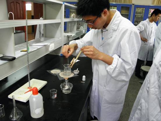 大赛共十二组,每组两名选手共同完成“粗盐的提纯”实验操作。首先由学习部部长陈助国强调比赛规则以及实验要求,接下来各组选手有条不紊的进行实验,秩序井然。在比赛过程中,老师们仔细、认真的观察着每组同学的操作,并认真指正,相互交流意见和看法。其中,王宪生教授指出:“粗盐的提纯是历年来非常经典的一个实验,看似很容易操作,但要想把实验做好,也并不容易。必须非常仔细认真,不能有丝毫懈怠。”