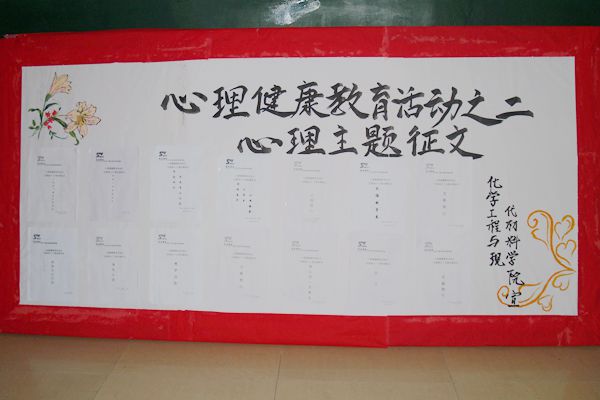 此次的征文活动文体不限,全院同学热情参与,通过征文来表达他们的心理健康教育的重视,共收到优秀征文100多篇,最终选择20篇进行展板展示。其中14级应用化学一班刘丽在“净化心灵”征文中从‘大学生集体宿舍心理分析、大学生消费心理分析、大学生恋爱心理分析、大学生就业心理分析’四个方面对大学生如何调整心理状态做了分析。13级化学一班杨卓在文章中提到“让学生正式现实,学会自我调节,保持同现实的良好接触,进行自我调节,充分发挥主观能动性去改造环境,努力实现自己的理想目标。”