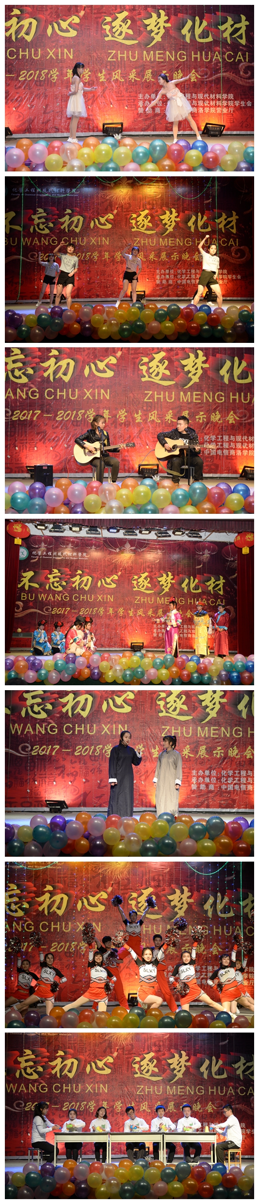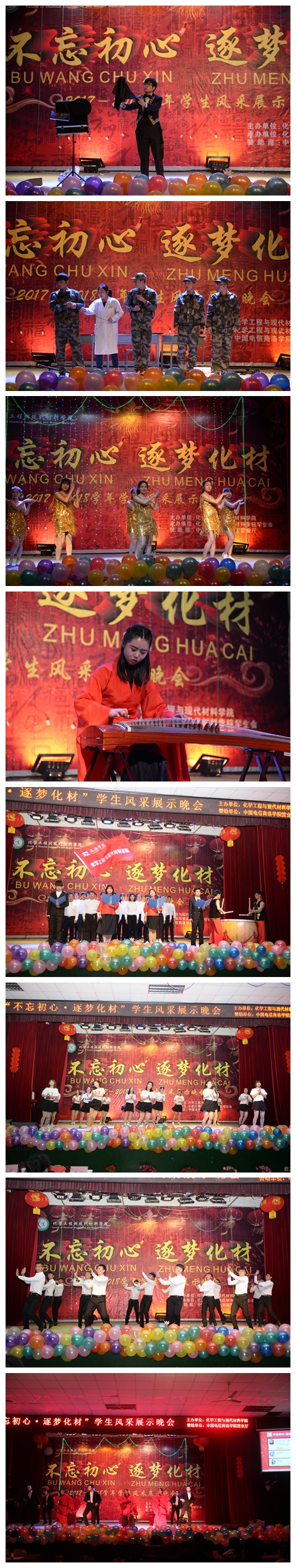 2017年12月13日晚7:30,化学工程与现代材料学院团总支在大学生活动中心举办“不忘初心,逐梦化材”2017-2018学年学生风采展示晚会。校团委副书记许薇,化材学院院长周春生教授、党总支书记李军富教授出席本次晚会,化材学院全体教师及2017级、2016级、2015级全体学生,各兄弟学院团总支书记、团总支副书记、学生会主席一同观看了晚会。