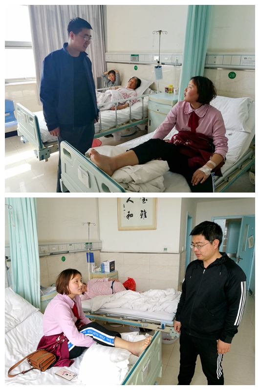 2018年4月3日,2017级辅导员王淦卿、班主任李峰前往医院看望化学1701班生病学生李海英。