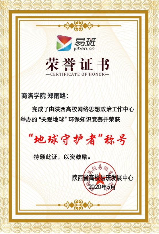 我校参赛师生围绕主题,开展了激烈的答题活动,获得由陕西高校网络思想政治工作中心颁发的“地球守护者”荣誉证书。