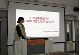 “时间一点点的流逝,现在的我们正处于如黄金般的年龄阶段,只有争分夺秒,才不会辜负这一段青春韶华。”18级各班此次主题班会的召开,使同学们意识到合理的利用时间才是对这段青春最大的尊重,只有珍惜分分秒秒,这段美好韶光才能不被辜负。作为当代大学生,要把握时代的脉动,从小事做起,从身边做起,自觉建设文明校园,让文明、和谐充满校园的每一个角落。