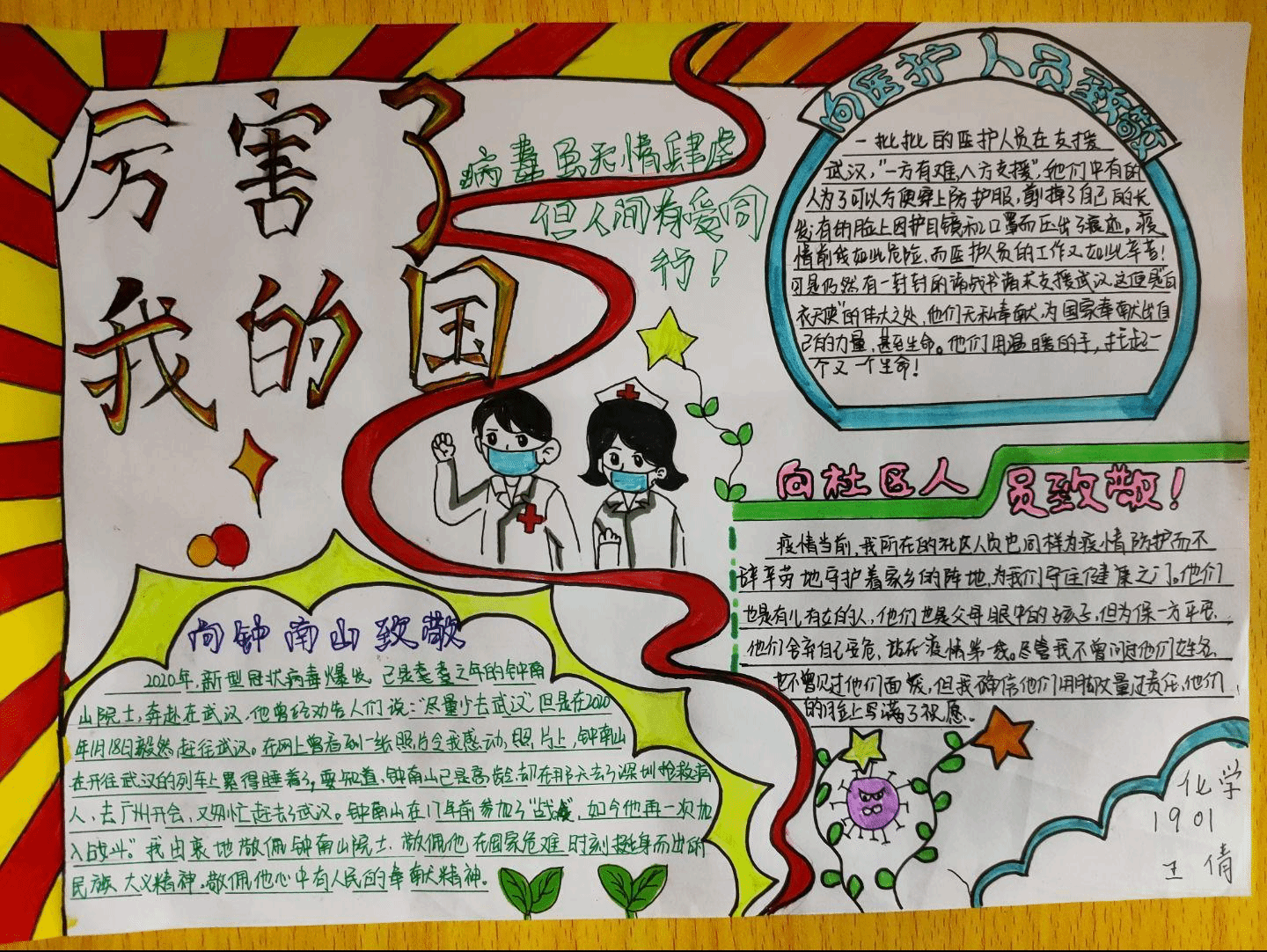 “厉害了,我的国!”、“我爱你,中国!”同学们用最直接、最饱含深情的语句,表达着自己对祖国浓浓的爱意。鲜艳的五星红旗、奋战一线的白衣天使……同学们用画笔描绘着2020年最动人的一幕幕,用这种特别的方式期盼祖国突破疫情的阴霾,春暖花开。书中显雪骨,画里呈江山,一幅幅五彩斑斓的色彩书诠释了爱国真谛,更彰显了我院学子的爱国热情。