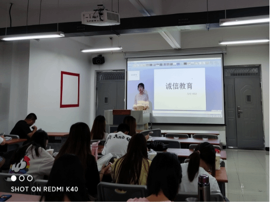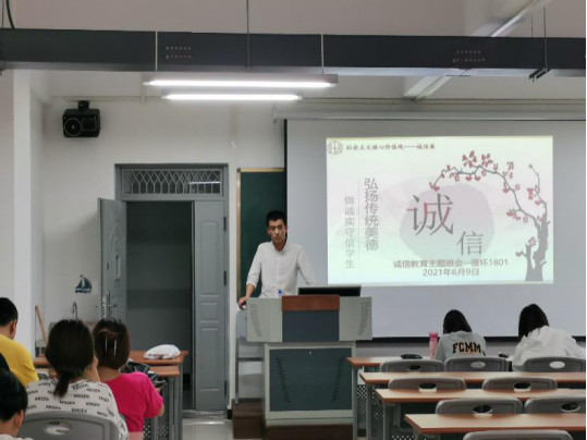 2018级辅导员王嘉琳在全年级组织开展了“诚信是为人之本,共创校园诚信氛围”的主题班会。通过学习学习《学生手册》上关于诚信考试的相关内容、反面警示案例等,使全体学生充分认识到诚信做人的重要意义,也明确了树道德之新风,立诚信之根本是当代学生义不容辞的责任。