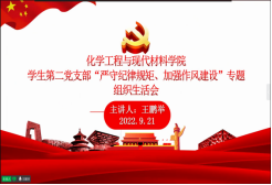2022年9月21日下午14:30,化学工程与现代材料学院学生第二党支部于钉钉平台开展了纪律教育宣传暨“严守纪律规矩、加强作风建设”专题组织生活会。本次会议由党支部书记王鹏举老师主持,支部全体党员参与了本次会议。