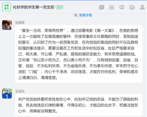 为做好我院纪律教育宣传月活动,深入学习贯彻习近平总书记关于加强纪律教育的重要论述,全面贯彻党的十九大和十九届历次全会精神,进一步落实习近平总书记关于“用党的历史教育党员、教育干部、教育群众尤其是教育青少年”的重要指示精神。2022年9月23日晚19:30-21:30,我院学生第一党支部全体学生党员及预备党员于钉钉平台共同观看了重大党史题材影片《第一大案》,本次观影活动由支部书记王嘉琳老师具体负责。