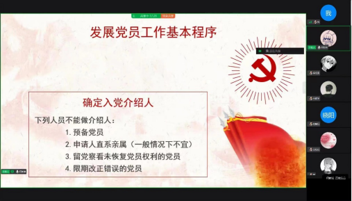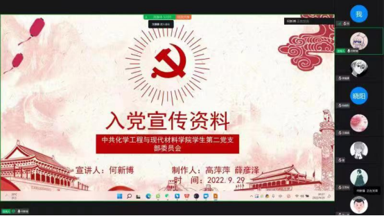 9月29日19:30,为使新生树立正确的入党动机,化学工程与现代材料学院学生第二党支部于钉钉平台开展了新生入党启蒙教育宣讲大会。本次会议由党支部书记王鹏举老师主持,支委会成员何新博带领新生进行了学习,22级材料循环专业全体新生参与了此次活动。