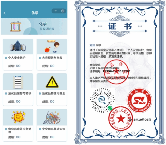 活动内容主要为慕乐网络开发的虚拟实验室安全知识考核,包括个人安全防护、火灾预防与自救、高温低温操作安全、玻璃器材使用安全、危化品储存与转移、危化品的使用安全、气瓶使用安全、废弃物的安全处理与管控、危化品意外应急处理、安全用电基础知识、高压釜使用安全、化工原理等实验室相关安全知识。学生以趣味通关的方式完成考核,闯关成功后即获得《实验室安全准入考试合格证书》。