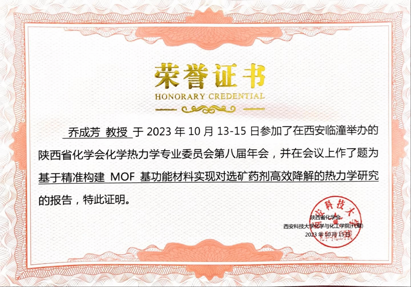 10月13日至15日,由陕西省化学会主办、西安科技大学化学与化工学院承办的陕西省化学会化学热力学第八届年会在西安科技大学举行。来自西安交通大学、西北工业大学、西北大学等近20所省内高校和科研机构的专家学者、研究生等80余人参加了会议。我院院长周春生教授及学院教师代表一行8人应邀参加会议。