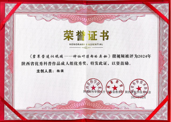 为全面贯彻习近平总书记关于科技创新的重要论述,落实党的二十大精神和全国科技大会精神,深入实施《中共中央办公厅、国务院办公厅关于新时代进一步加强科学技术普及工作的意见》,加强我省科普能力建设,省科技厅、省教育厅、省科协共同组织开展了2024年陕西省优秀科普作品征集活动。2024年12月31日,陕西省科技厅、陕西省教育厅、陕西省科协联合公布了2024年陕西省优秀科普作品获奖结果,我院教师杨强的作品《碧翠莹透似琉璃---神仙叶凉粉的奥秘》荣获陕西省优秀科普微视频作品优秀奖,全省共推荐309部作品参赛。
