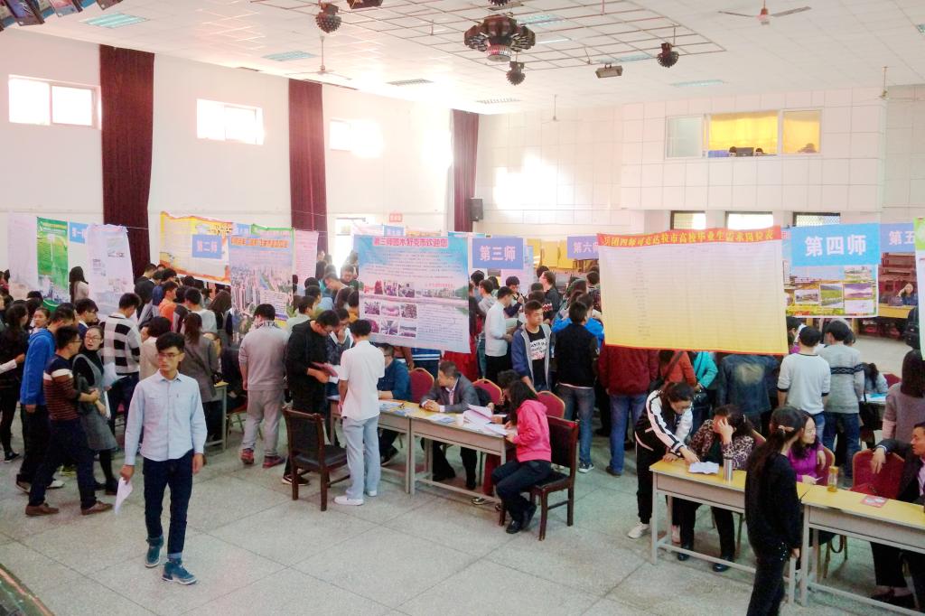 我院积极组织2013级应届生和2014级学生参新疆生产建设兵团专场招聘会。应聘学生在各单位展位前认真阅读招聘简章,了解新疆的社会经济现状和发展前景,仔细询问招聘岗位要求、待遇及职业发展前景,向有意向单位投递简历和自我介绍。用人单位代表耐心地为毕业生热情介绍情况,解答咨询问题,严格审查自荐材料,认真考核面试,现场不时有毕业生和单位达成共识并签订就业协议。