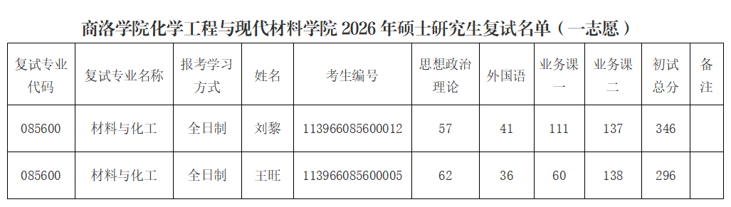 商洛学院化学工程与现代材料学院2026年硕士研究生复试名单(一志愿)