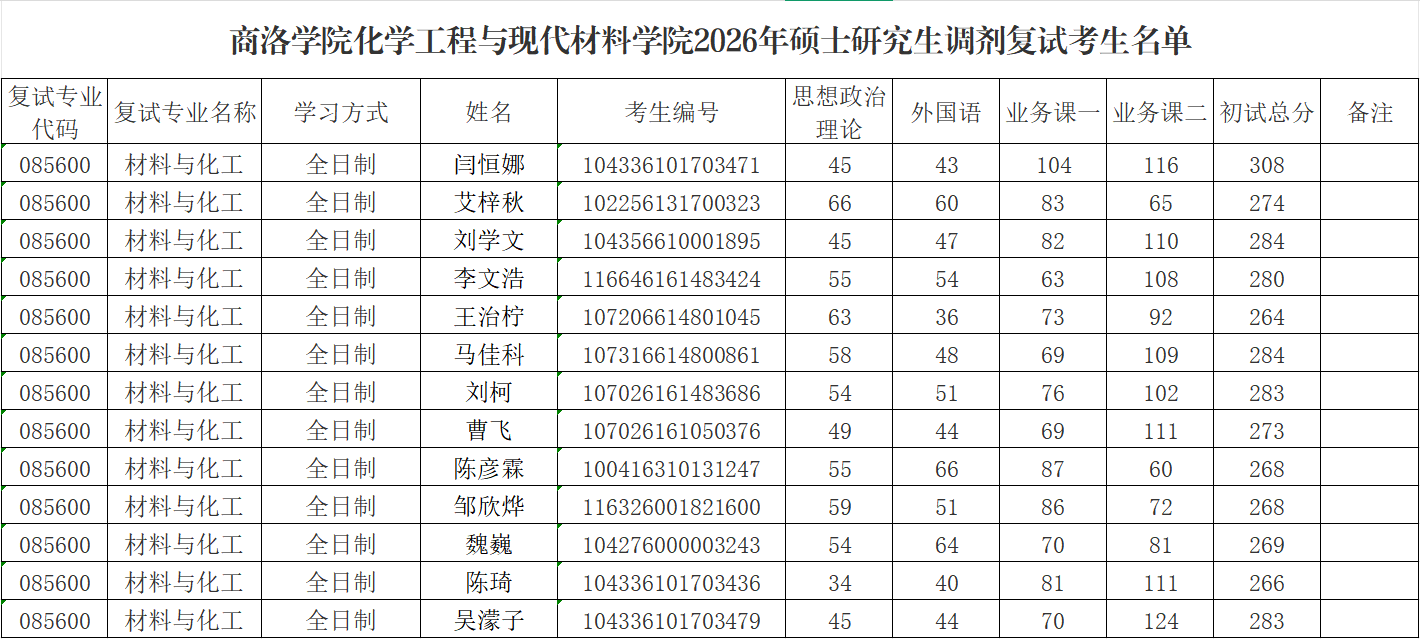 商洛学院化学工程与现代材料学院2026年硕士研究生调剂复试考生名单