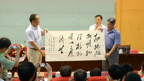 为表达对赵鹏大院士的敬意和感谢,龙治刚代表学校向赵院士赠送了“勘地脉以明物理,核物用以应济世”书法作品。我院青年教师向赵院士赠送了鲜花。