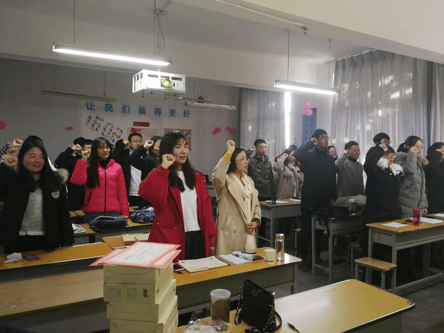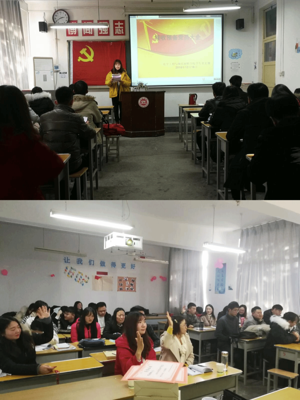 2018年12月18日,我院学生党支部在5号楼307教室召开接收预备党员暨预备党员转正大会。学生第一党支部书记陈玉萍同志、学生第二党支部书记高霞同志、教师代表元飞同志、8名学生正式党员和12名学生预备党员参加会议。大会决定接收高妮等12名同志为预备党员,同意郝东同志按期转为中共正式党员。