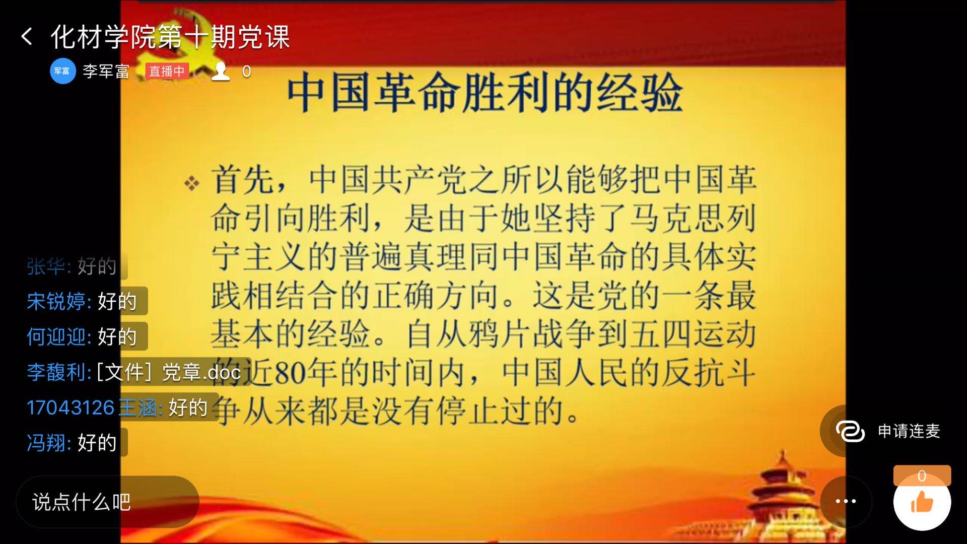 开班仪式完成后,院党总支书记李军富为入党积极分子上第一堂党课——《中国共产党的成立》。依照安排,其余党课集中在8月19日和8月21日陆续开展,学员开展线上讨论,提交心得体会,预计24日完成培训进行考试。
