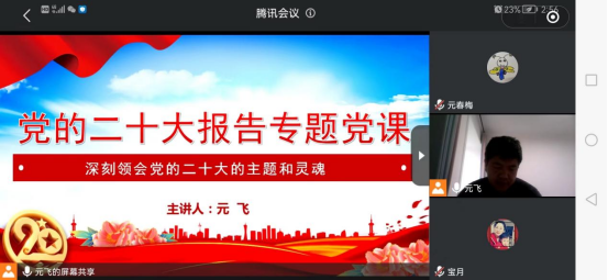 为深入学习党的二十大报告,凝聚奋进新时代的精神力量,11月30日下午3点化材学院教工第二党支部通过线上腾讯会议方式开展专题党课活动,围绕学习党的二十大报告讲授专题党课。活动由元飞同志主持并授课,支部全体党员参加。